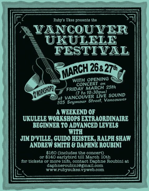 2nd Annual Vancouver Ukulele Festival hosted by Ruby’s Ukes. I’ll be joining some of Canada’s top players and instructors including Ralph Shaw and Guido Heistek. This is a small festival that is a lot of fun!